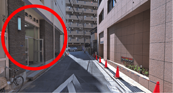 交差点を渡った先の細い道を進むと、当ビル入り口の玄関が見えてきますので、そちらから事務所までお進みください。